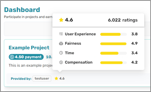 The expanded rating system allows participants to rate the user experience, fairness of the project, accuracy of the time estimate, and quality of the compensation. All ratings contribute to a researcher’s reputation.