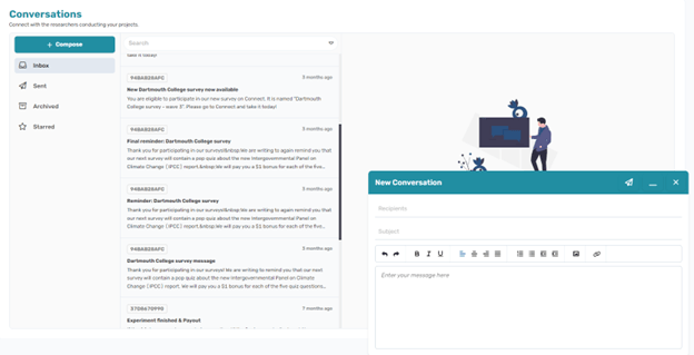 Built-in Messaging. On Connect, we wanted to make communication between participants and researchers as seamless as possible while maintaining participants’ anonymity; anonymity is often a requirement of Institutional Review Boards, but lacking in many online platforms. Our built-in messaging system allows researchers and participants to send each other messages without needing to include any identifying information. Recipients receive a notification on Connect as well as to their email. This messaging system also comes in handy when researchers want to inform participants about their eligibility for follow up studies, or ask for more detail about their survey responses.